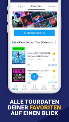 Personalizați-vă aventura în evenimente adăugând artiștii și locațiile preferate, fie dintr-un clic, fie prin integrarea cu librăria muzicală locală sau Facebook. Această pagină de pornire inteligentă vă ține la curent cu tot ce contează pentru dumneavoastră, în timp ce notificările push vă alertează instantaneu despre lansări de bilete, anunțuri de turnee și date suplimentare, astfel încât să nu ratați niciodată un spectacol mult așteptat. Explorați inspirația evenimentelor prin lumi tematice și rapoarte de la fani, iar după participare, împărtășiți-vă impresiile prin recenzii. Gestionează-ți în siguranță biletele digitale, comenzile și alertele direct prin contul tău EVENTIM sau Facebook. Descoperiți nume mari ca Rock am Ring, Hurricane, sau evenimente familiale precum Holiday on Ice, toate adaptate pentru a vă oferi experiențe unice.