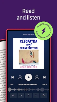 Experimentează lectură la cel mai înalt nivel cu cititorul de cărți electronice Nextory, care îți permite să ajustezi dimensiunea fontului, luminozitatea ecranului și culoarea de fundal pentru o experiență perfect adaptată. Funcțiile de marcare și semne de carte te ajută să revii oricând la pasajele preferate sau să continui exact de unde ai rămas. Pe tabletă, te poți bucura de o vizualizare dublă a paginilor, care simulează senzația unei cărți fizice. Playerul audio integrat îți oferă control total: ajustează viteza de redare, navighează rapid prin capitole și setează un temporizator de oprire pentru o audiție relaxantă. Urmărește-ți progresul și bucură-te de conținut chiar și în modul de economisire a energiei, având mereu o bibliotecă vastă la îndemână, mult mai accesibilă și ușoară decât cărțile fizice tradiționale.