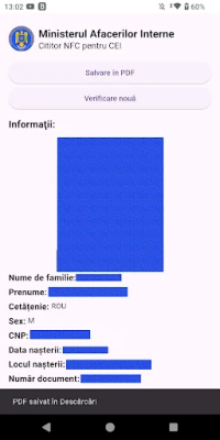Vizualizați cu claritate fiecare detaliu important: de la nume, prenume, CNP, sex și cetățenie, până la data și locul nașterii, domiciliu, precum și datele complete ale documentului (număr, emitere, expirare). Atunci când este disponibilă pe cip, fotografia titularului va fi, de asemenea, afișată pentru o verificare vizuală suplimentară. În plus, aveți posibilitatea de a salva cu ușurință aceste informații, inclusiv adresa de domiciliu, într-un fișier PDF, ideal pentru arhivare sau partajare controlată. Procesul de verificare este optimizat pentru scanări repetate, asigurând o experiență rapidă și eficientă.