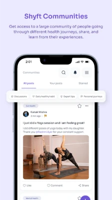 Beneficiază de ghidare personalizată prin sesiuni live 1-la-1 cu nutriționiști clinici calificați, care îți vor crea planuri alimentare adaptate și îți vor oferi suport prin chat 24/7. Interacționează cu antrenori de obiceiuri dedicați, care te vor menține motivat pe parcursul călătoriei tale spre bunăstare. Participă la cursuri interactive de exerciții și yoga cu antrenori de elită, cu o flexibilitate a programului de la 6 AM la 9 PM. În plus, Shyft îți permite să monitorizezi indicatorii cheie de sănătate și să stochezi în siguranță documentele medicale, de la IMC și evaluări ale stresului până la rapoarte de laborator și prescripții. Alătură-te unei comunități vibrante unde poți împărtăși experiențe și învăța de la alți membri aflați în călătorii similare spre o viață mai sănătoasă.