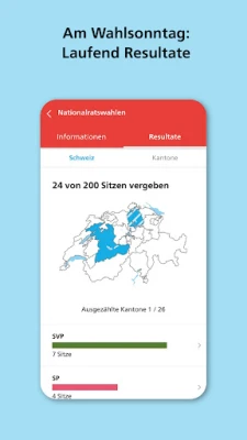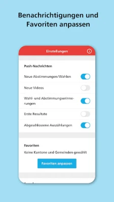 Pe măsură ce ziua votului se apropie, VoteInfo devine partenerul dumneavoastră în timp real. Începând cu ora 12:00 în duminica alegerilor sau a referendumului, urmăriți rezultatele provizorii actualizate constant. Fiți printre primii care află rezultatele oficiale finale, grație notificărilor push configurabile. Personalizați-vă experiența selectând cantoanele și comunitățile de interes, asigurându-vă că primiți doar informațiile relevante pentru dumneavoastră. Configurați alertele pentru noi propuneri, videoclipuri explicative, primele rezultate sau numărători finale. O funcție de reamintire configurabilă vă asigură că nu uitați niciodată să participați la vot.